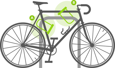 If your bike has fixed wheels (i.e. not quick release), attach the approved lock around the frame and the immovable object (examples: point A or B).
