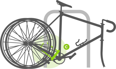 If one or both of your wheels are quick release, attach the approved lock around the rear wheel, removed front wheel, the frame and the immovable object (point C).