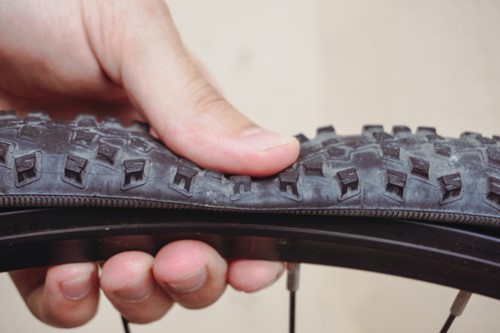 Once the inner tube is deflated, use your hands to squeeze the tyre inwards and push the bead into the centre of the rim. Work your way around the whole tyre until it feels baggy all the way round.